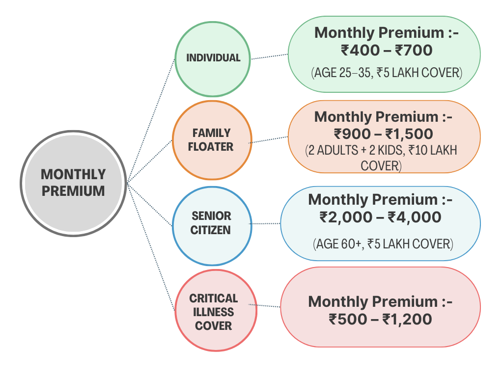 Health insurance premiums in India vary based on several factors such as age, sum insured, family size, medical history, and the type of coverage selected. Younger individuals usually pay lower premiums, while senior citizens and higher coverage plans cost more. Choosing the right plan helps you balance affordability with adequate protection. Below is an estimated monthly premium range for different profiles to give you a general idea: